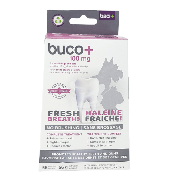 If you forget to brush your pet’s teeth every day or if your pet does not agree to have their teeth brushed, buco+ is the solution to keep your mind at ease. Buco+ is a 100% natural supplement, effective in preventing and reducing oral problems such as bad breath, tartar and plaque. Top-quality functional ingredients. Simply sprinkle buco+ on their food to prevent and reduce oral problems such as bad breath, plaque, tartar and thus avoid more serious health problems related to poor dental hygiene. For cats and dogs 6 months or older.