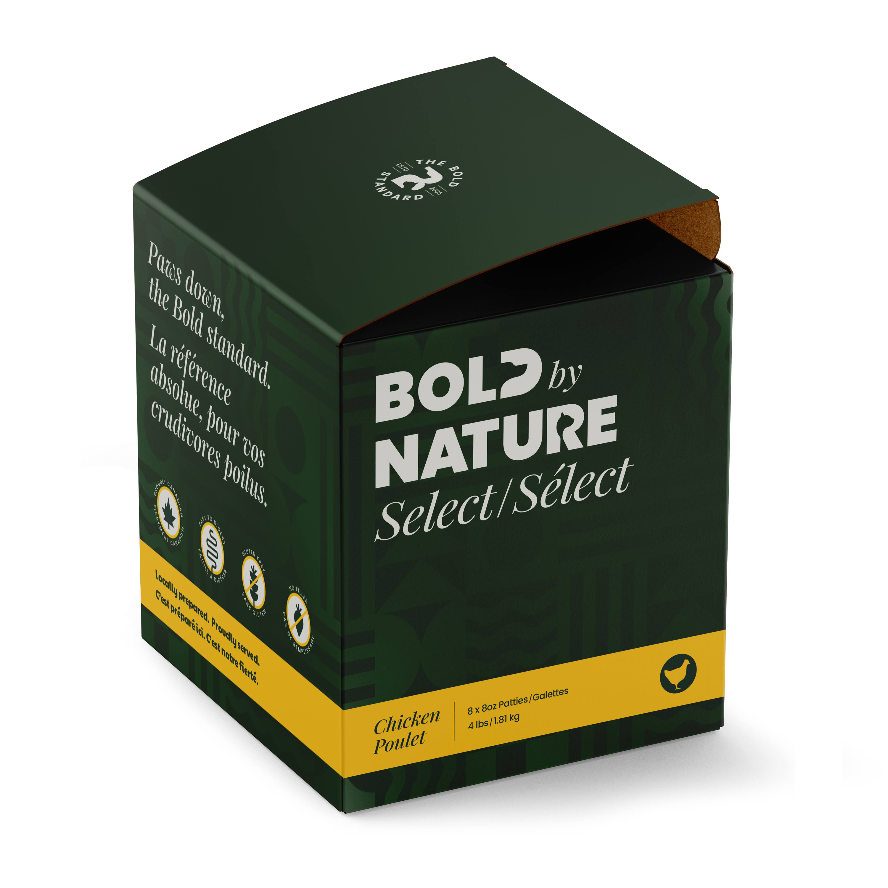 Bold by Nature Select Chicken patties are formulated as nature intended. With farm-fresh ground chicken meat, triple-ground bone, organ meat, green beef tripe, and no fruits or veggies, your pet will he healthy and thriving.