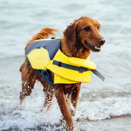 The Canada Pooch Wave Rider Life Vest is made with high buoyancy foam and a durable shell to provide safety while swimming. It features a super float chin flap for head support, adjustable chest and neck straps, a D-ring for leash attachment, and a top assist handle.