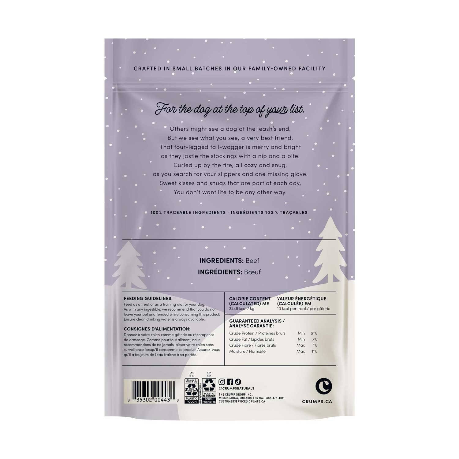 This holiday season, delight your pet with the festive flavours of Crumps’ Naturals Naughty Nibbles. These delectable treats are crafted from premium quality beef, offering a satisfyingly chewy texture and irresistible flavour. Made with all-natural ingredients and free from artificial additives, Naughty Nibbles are the perfect way to show your pet some love while promoting their overall well-being. Treat your loyal companion to a mouthwatering experience they’ll wag their tail for! Bag weighs 138g.