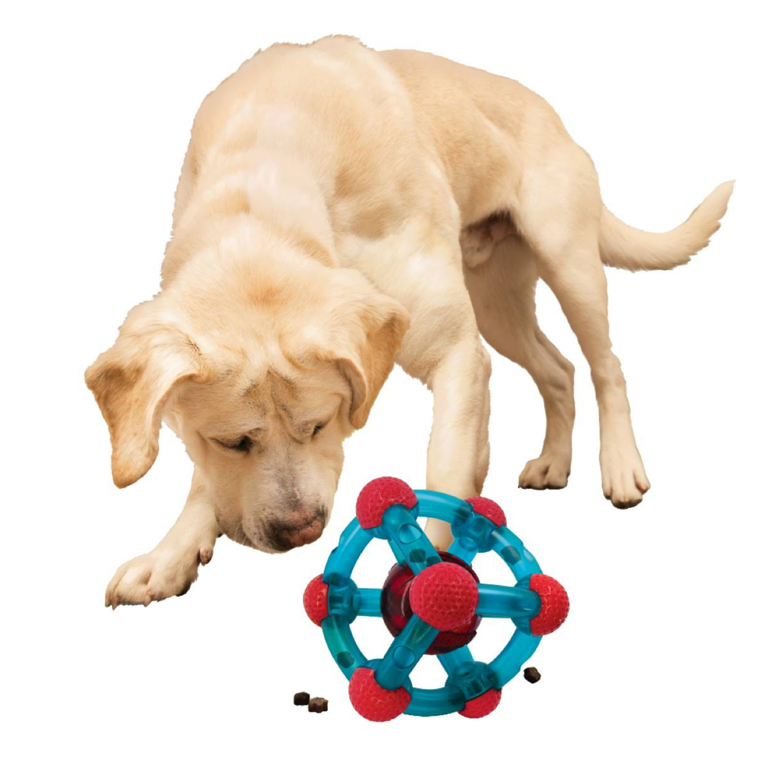 Randomly dispenses treats through holes in 6 different spots. Releases kibble as it rolls and bounces. Funnel makes it easy to fill. Use for meals to help manage weight. Corners mute play for quieter action.