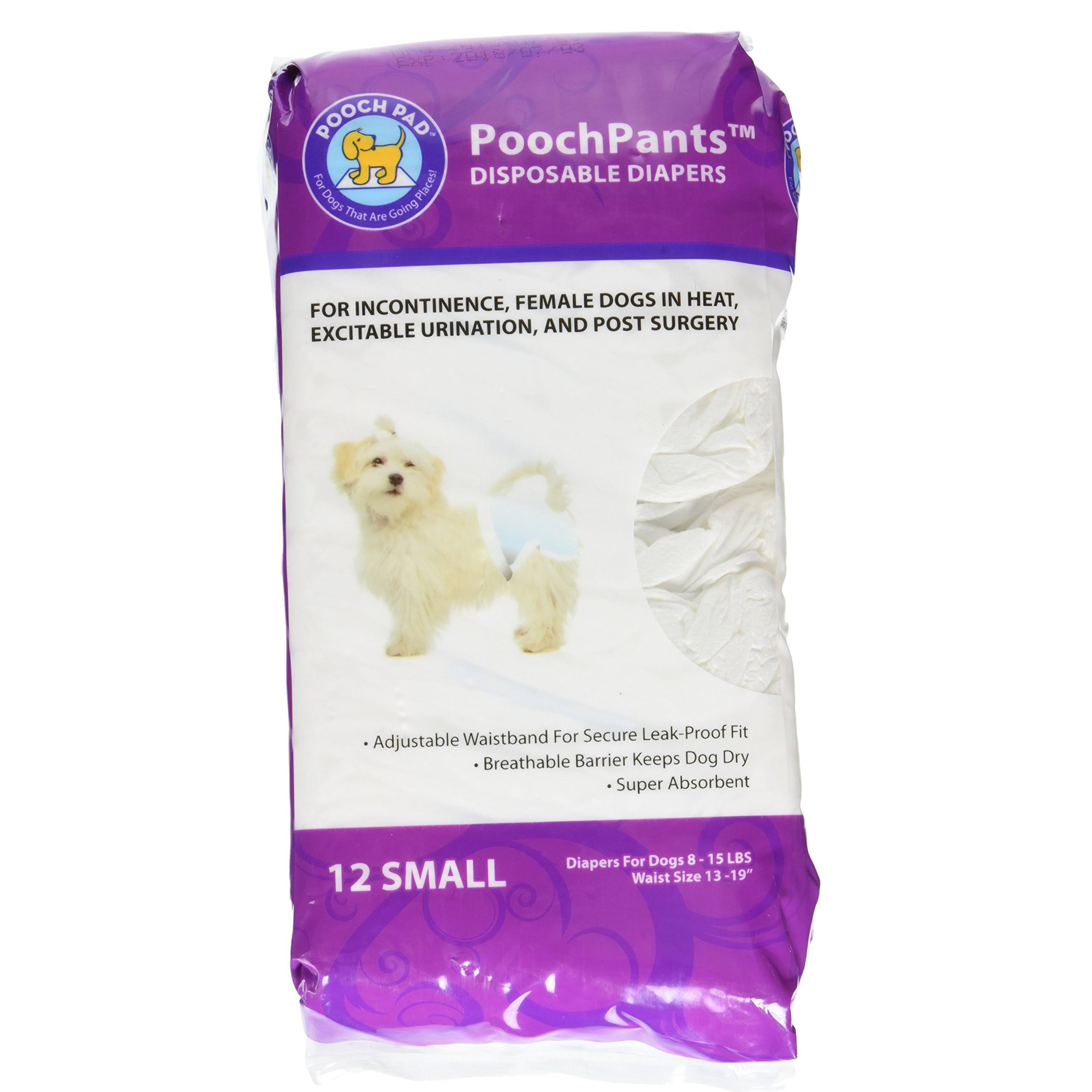 PoochPants Disposable Dog Diapers -are effective to manage incontinence, female dogs in heat, excitable urination and post surgeries. Adjustable waistband for secure leakproof fit, with a breathable outer barrier to help keep dog dry. Composite multi-layered construction combines absorbent polymers between waterproof and microquilted membranes for superior absorbtion and odor control.