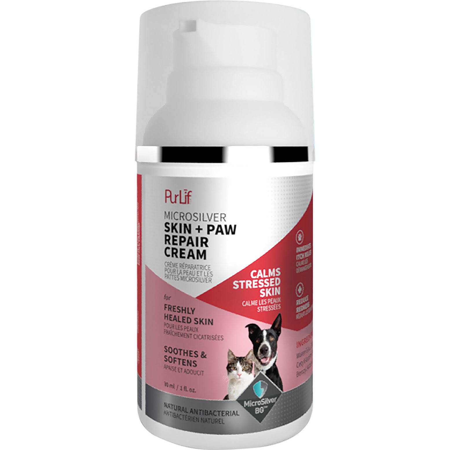 MicroSilver Skin + Paw Repair Cream A gentle, unscented moisturizing cream to help mend and care for freshly healed skin and dry, cracked paws. Rich non-greasy formula absorbs quickly. Enriched with MicroSilver, zinc, panthenol and Vitamin E to restore optimal skin health. Relieves itch and redness.