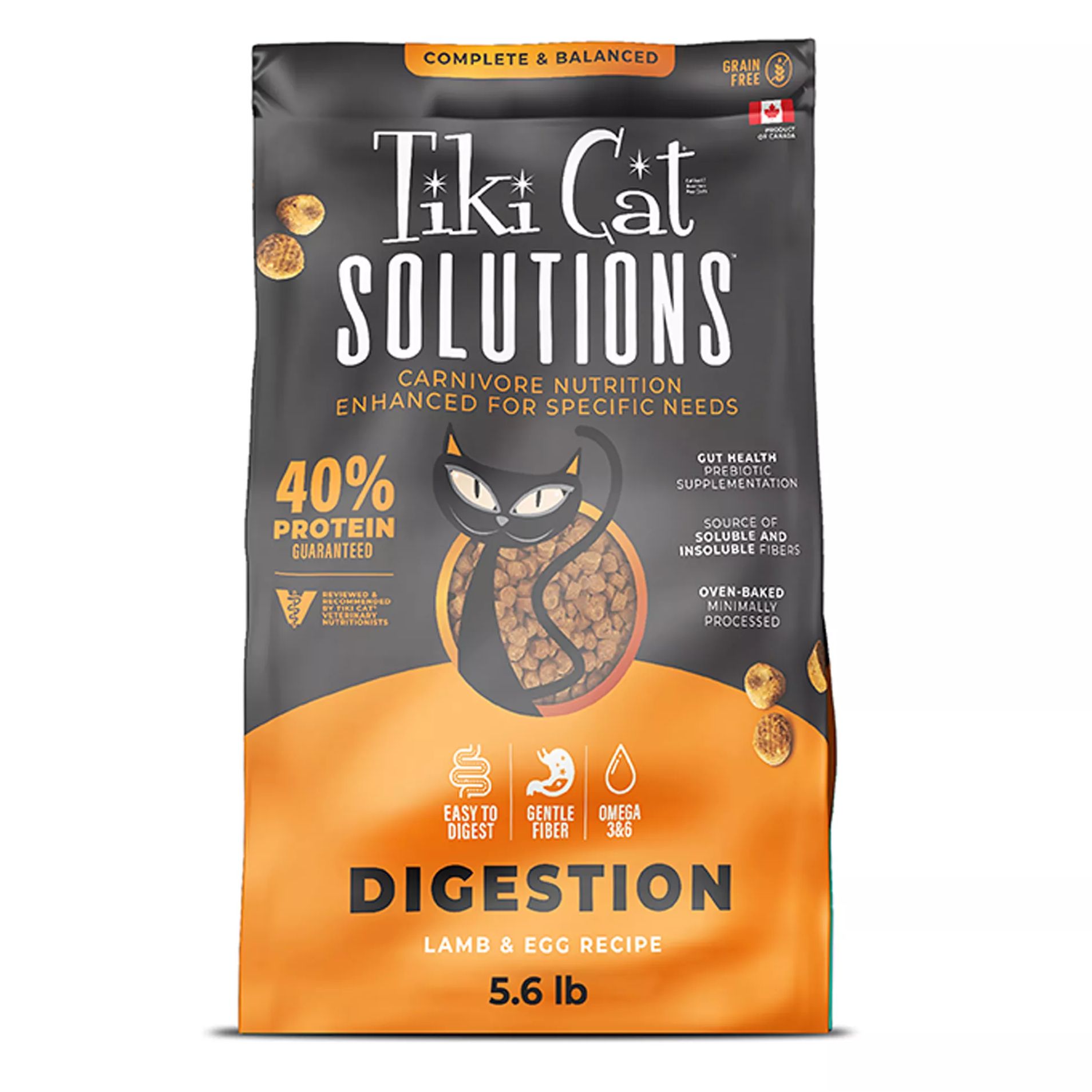 SUPPORTS HEALTHY DIGESTION. All cats are born carnivores, but some have special nutritional needs. Tiki Cat Solutions Digestion Baked Kibble is protein-rich, with highly digestible Lamb and Egg. Includes valuable nutrients and may encourage eating, while multiple fiber sources help to move food through the digestive tract. Potato and grain-free, plus balanced omega 3 & 6 fatty acids for beautiful skin and coat.
